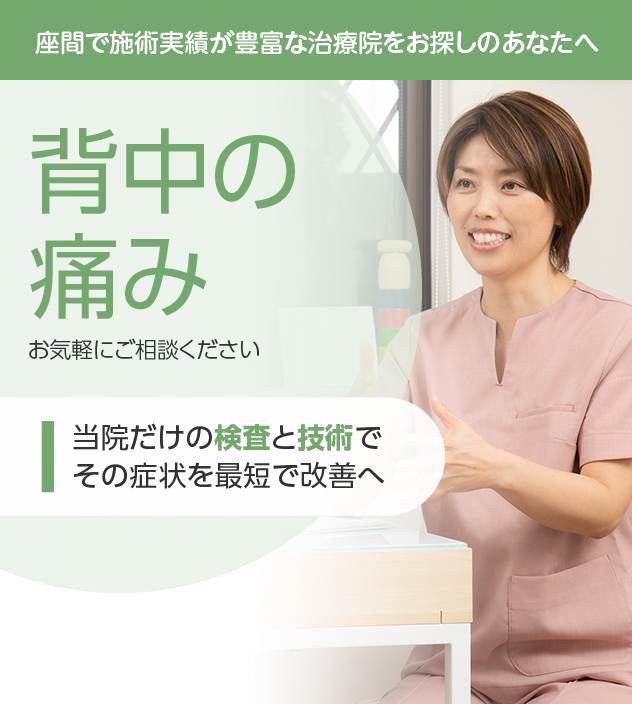 背中の痛みは姿勢や生活習慣まで見直さなければ根本改善が難しい症状です。快適な毎日を目指し、検査と施術で未来を変えていきましょう。